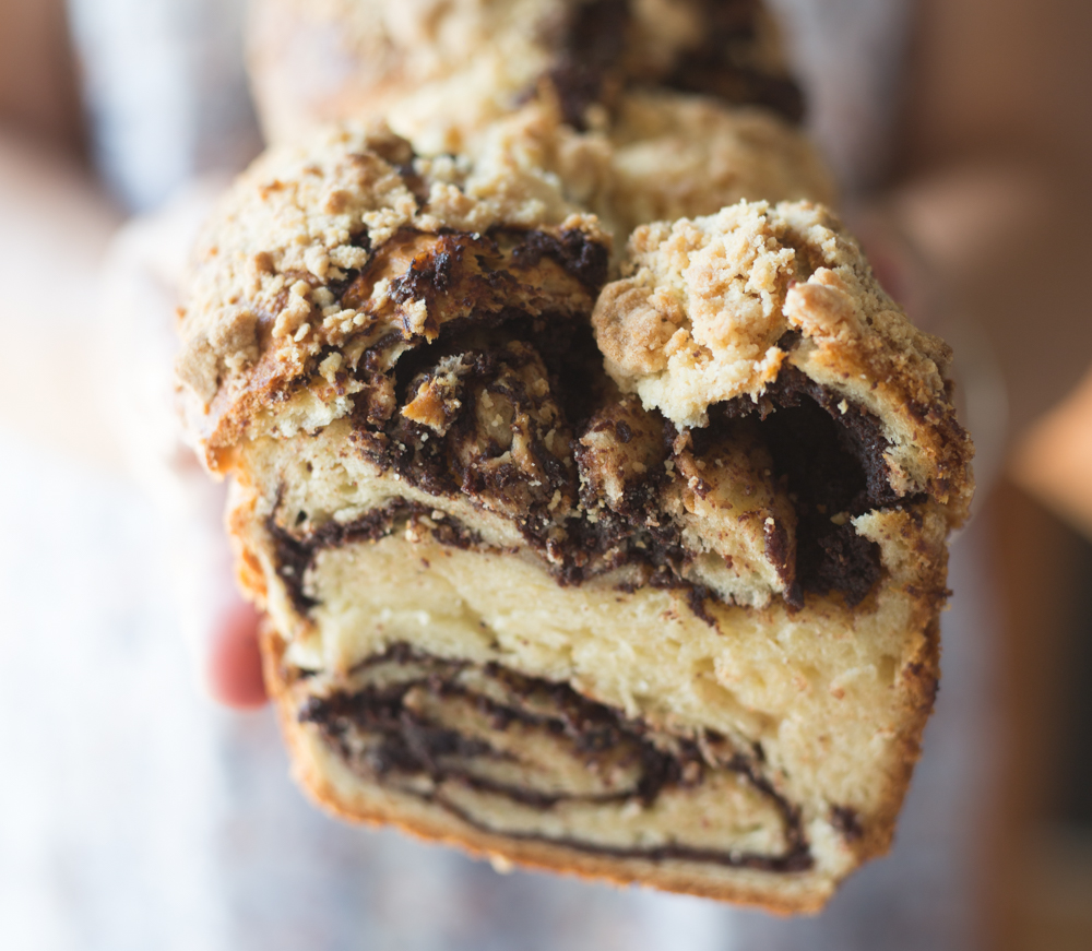 באופן שווה על גבי הבצק. מגלגלים לרולדה. מקפלים את הרולדה לשניים לצורת פרסה, ומלפפים לבורג.