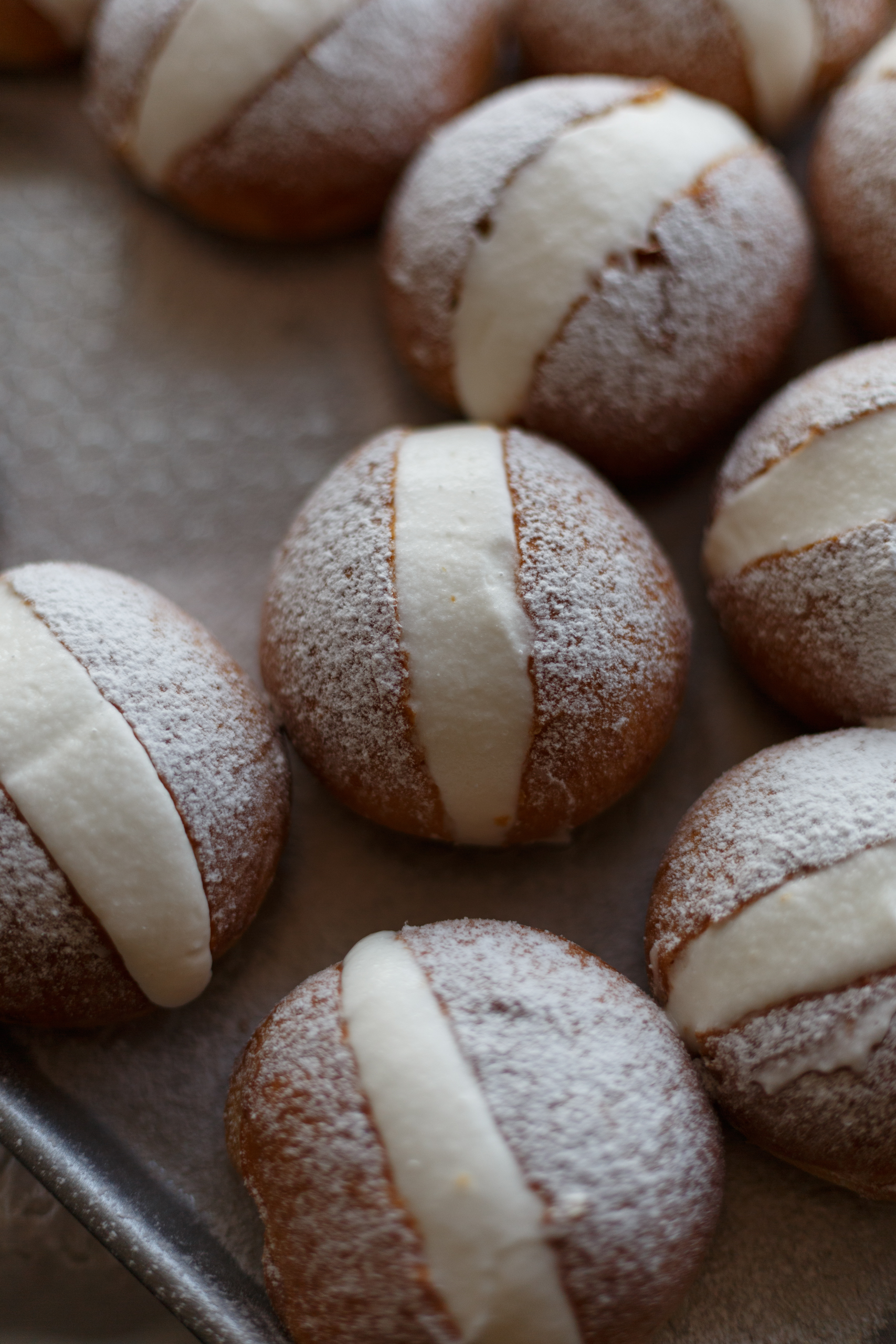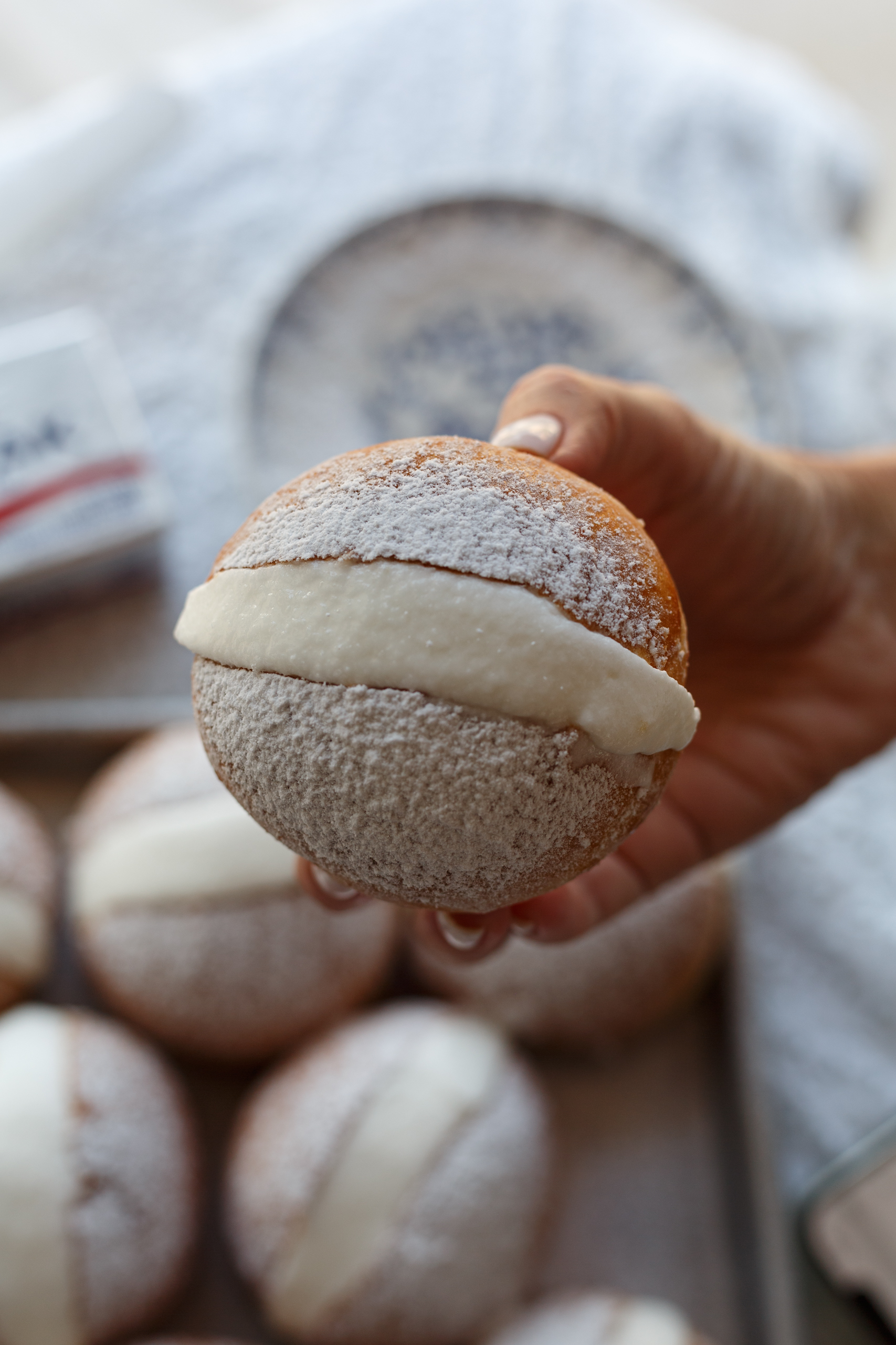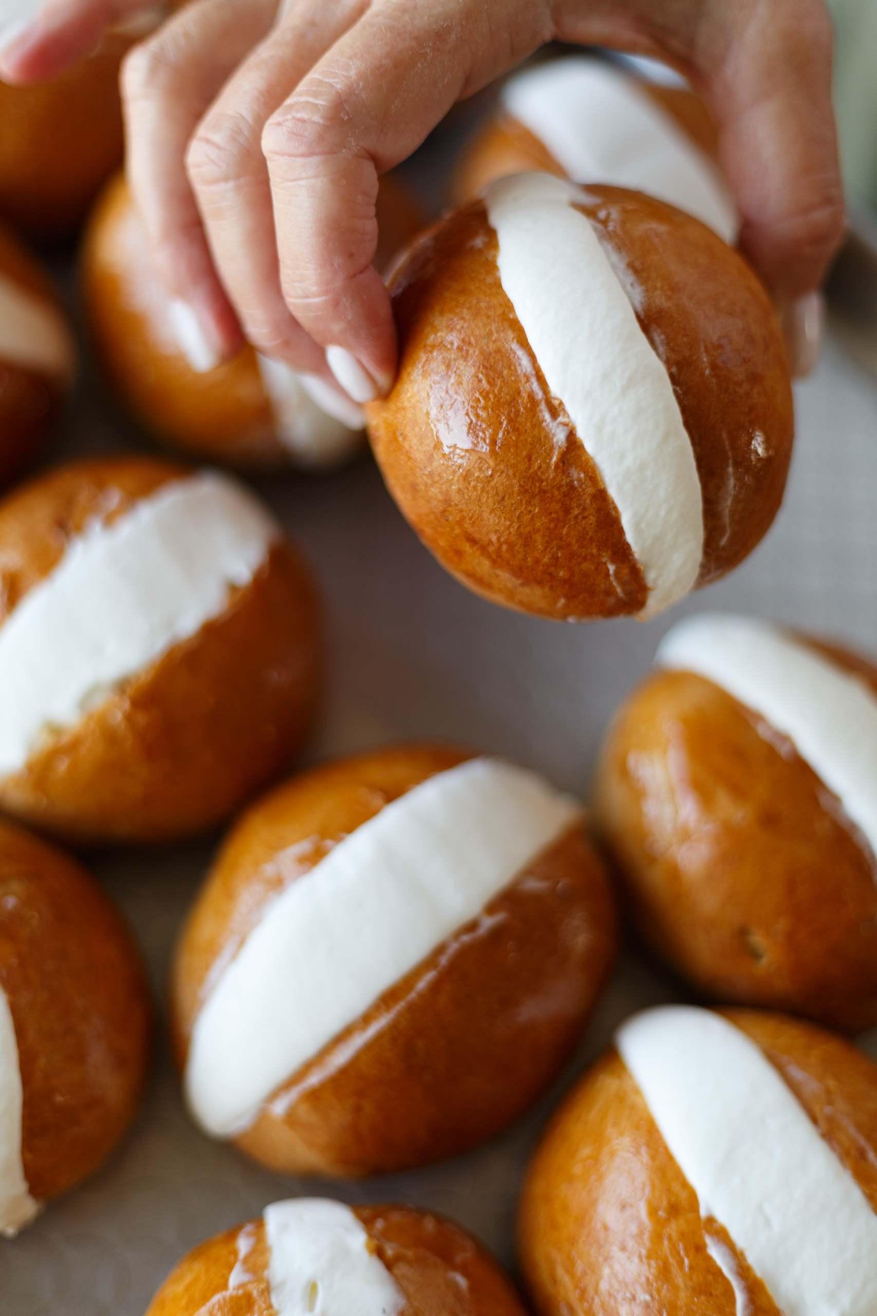 מעבירים את הקצפת לשקית זילוף, או שבעזרת כף, ממלאים כל לחמניה בקצפת, ובעזרת