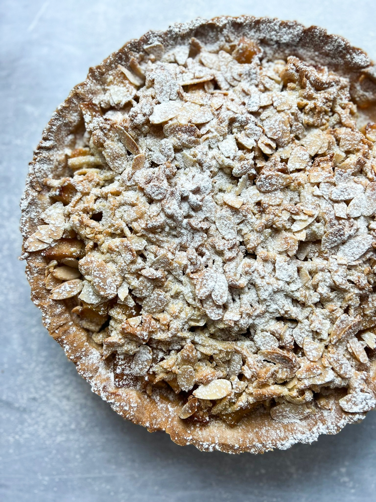 מפזרים שקדים פרוסים מעל ואופים 25-30 דק׳ עד שהפאי זהוב למראה והתפוחים מבעבעים.