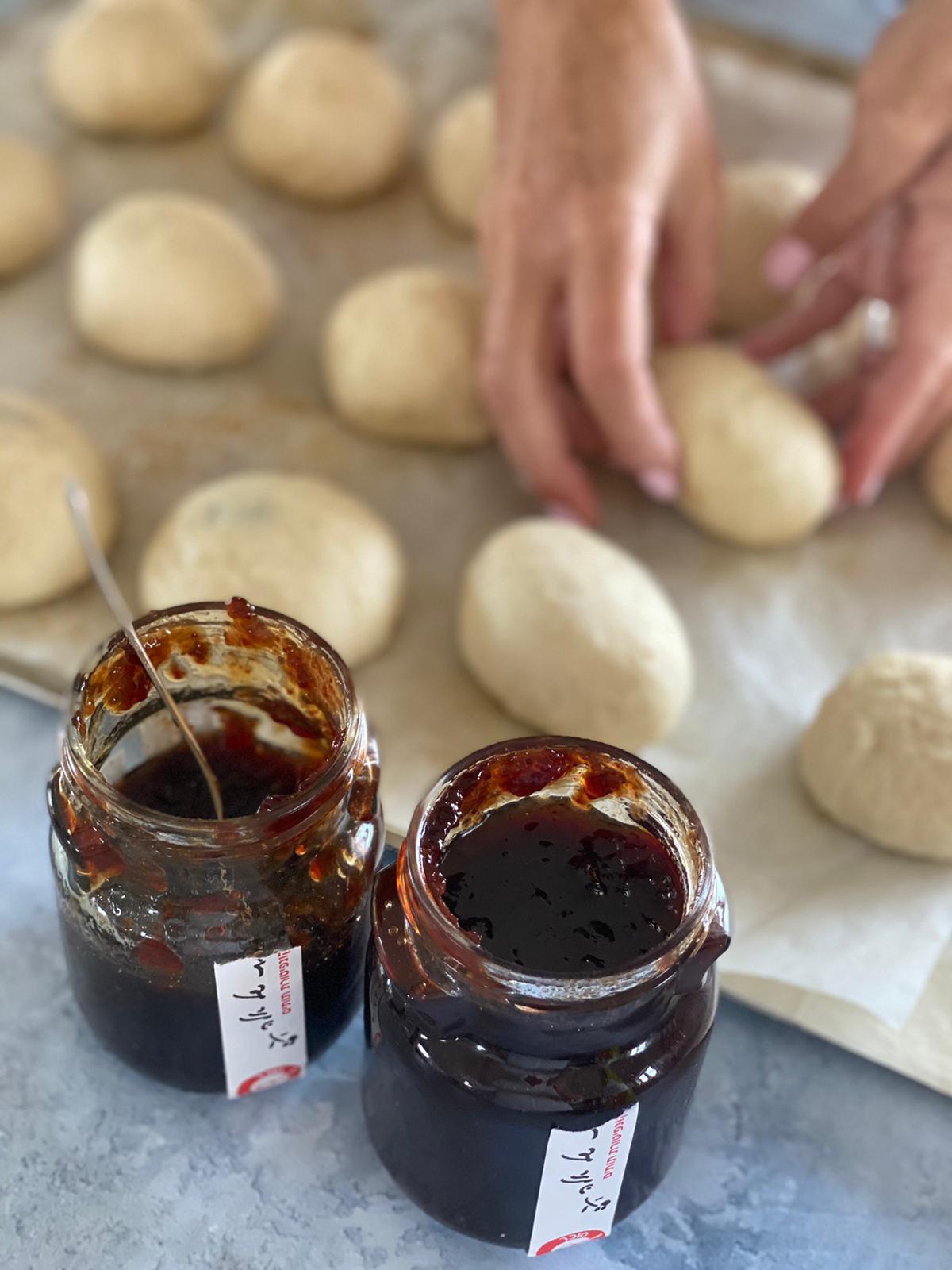 בעזרת הידיים פותחים את הכדור ויוצרים גומחה קטנה במרכז שלו. ממלאים כפית ריבה בגומחה