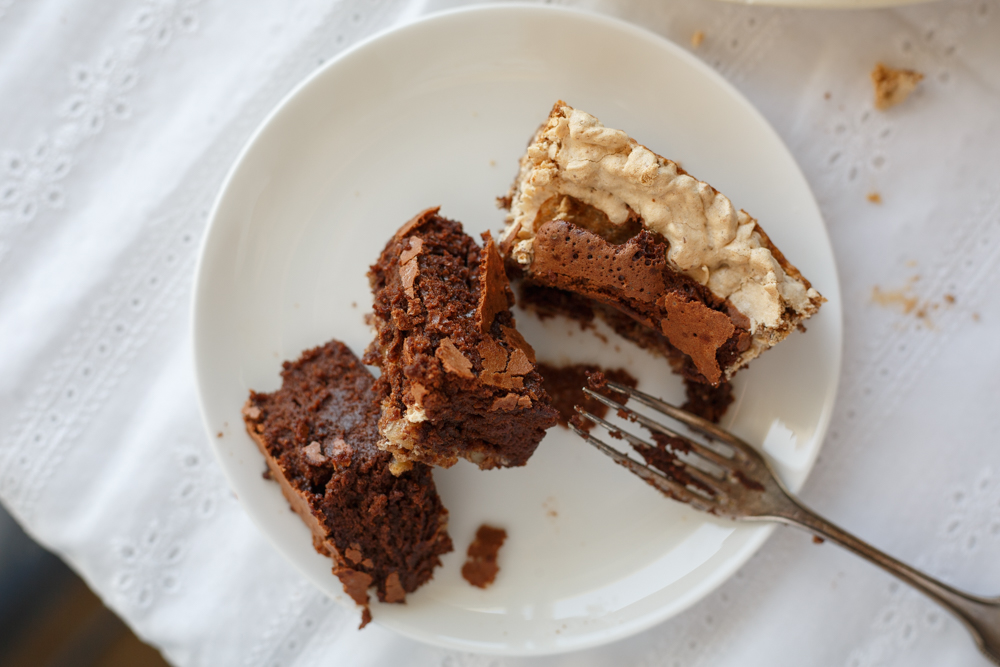 עוגה נהדרת. החלק השוקולדי בצורה מושלמת יושב ליד מרנג אגוזי לא יבש. תודה.